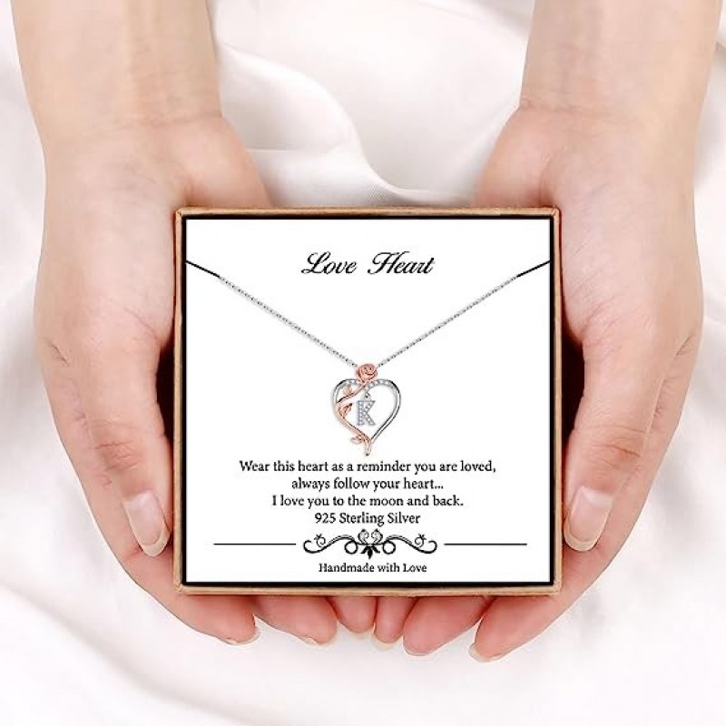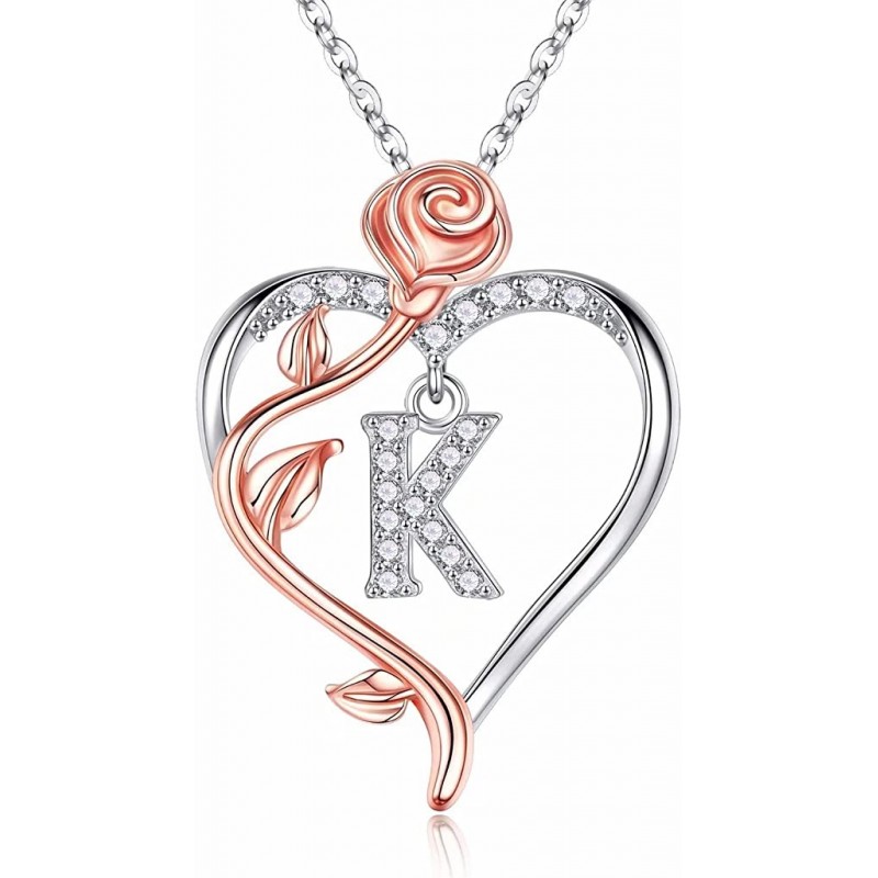 Iefil Rose Heart Necklaces Gifts for Women,925 Sterling Silver Rose Love Heart Initial Letter Pendant Necklace Jewelry Mothers Day Valentines Anniversary Birthday Gifts for Her Mom Wife Girlfriend