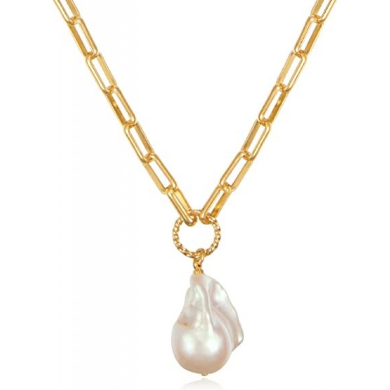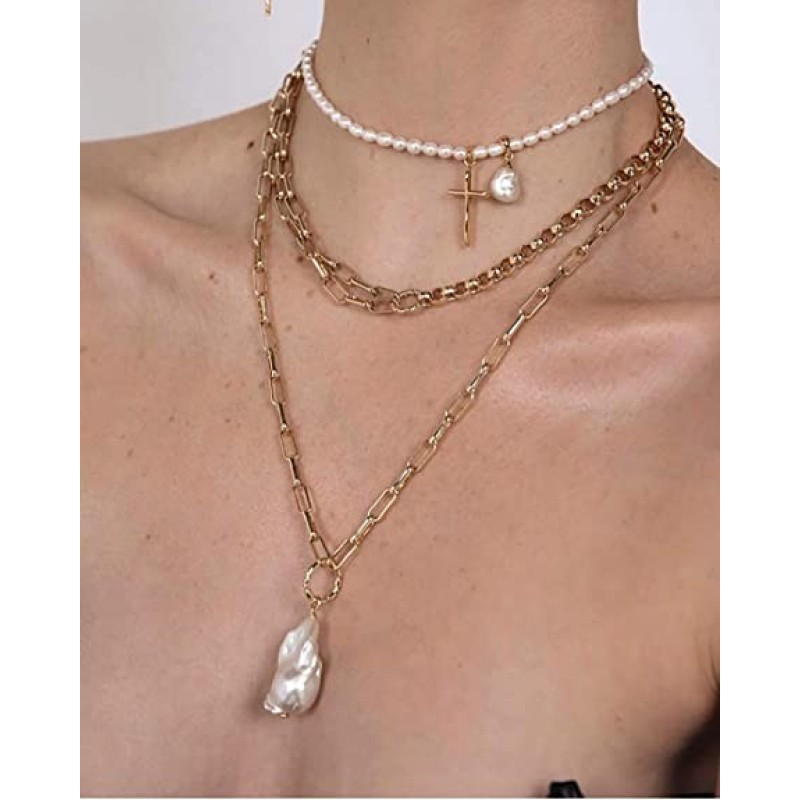 YorzAhar 18 quilates de oro collar de cadena satélite con collar de cadena colgante de perlas barrocas, collar de clip, collar de perlas cosidas conjunto de joyería de las mujeres